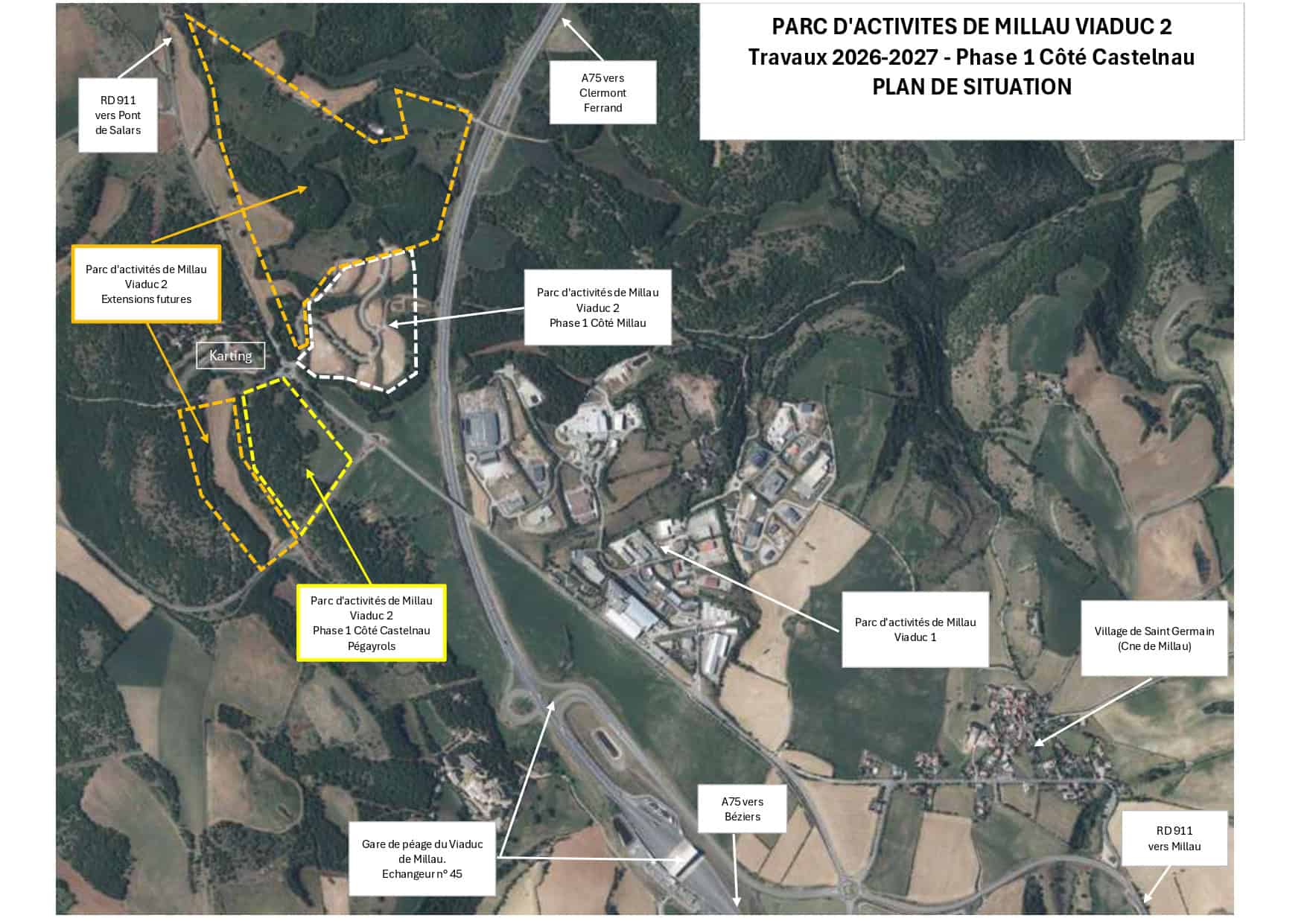 La zone Millau Viaduc 2 (sur les secteurs des communes de Millau et de Castelnau-Pégayrols) est en cours d’aménagement par tranche selon un principe de quatre à six phases sur les quinze à vingt ans qui viennent. La fin de l’ensemble des travaux de la phase 1 (Castelnau-Pegayrols et Millau) est prévue pour l’été 2027.